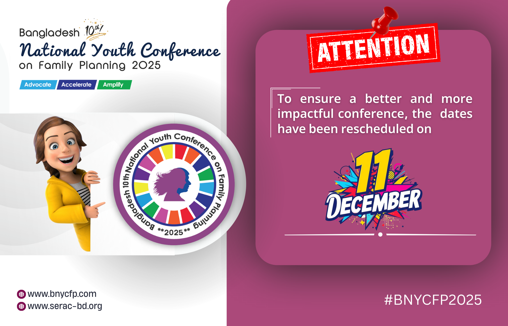 Important Announcement Dear BNYCFP2025 Delegates, We wish to inform you that the Bangladesh 10th National Youth Conference on Family Planning (BNYCFP) 2025 has been rescheduled. New Dates: 11 December, 2025 This change has been made to ensure the participation of high-level guests and to allow for a more inclusive, impactful…